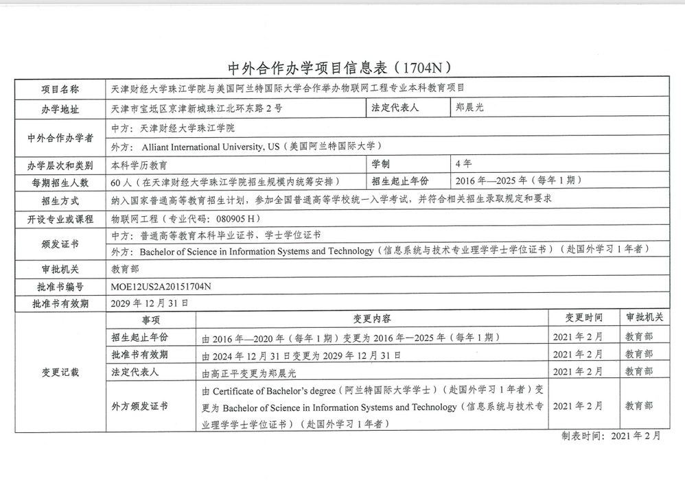 2015年8月,《教育部关于公布2015年上半年中外合作办学项目审批结果的通知》(教外【2015】57号)下发,我院与美国阿兰特国际大学(Alliant International University)合作举办物联网工程专业本科教育项目获得教育部批准。该项目纳入国家普通高等教育招生计划,于2016年招生。该项目为“3+1”模式,即前三年在本院学习,第四年赴阿兰特国际大学就读,毕业颁发中外双方学位。