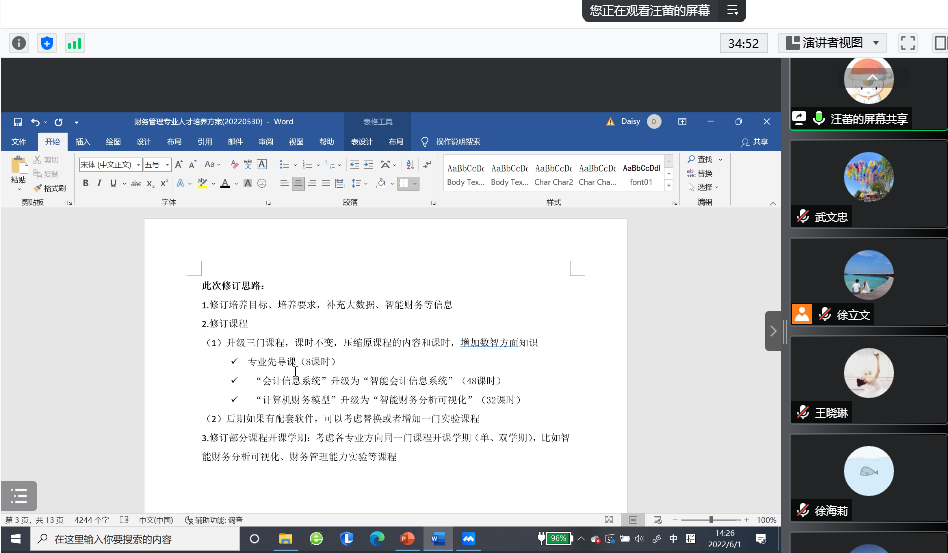 6月1日下午,教师教学发展中心王志宇名师工作室与会计学系采用线上方式联合举办“人才培养方案”优化研讨。王志宇教授分享人才培养方案建设思路,汪蕾、汤小芳、马丽欣三位老师介绍相关专业建设情况,会计学系全体教师参与研讨,系主任韩传模教授进行总结。