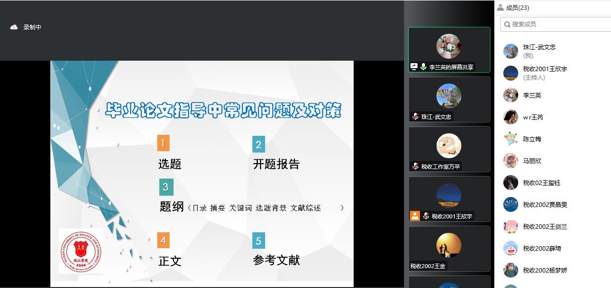 11月23日下午,教师教学发展中心、李兰英名师工作室、财税系联合税收工作室以线上形式举办2023届毕业论文指导专题研讨会。财税系全体教师及税收工作室部分学生参会,李兰英教授主持。