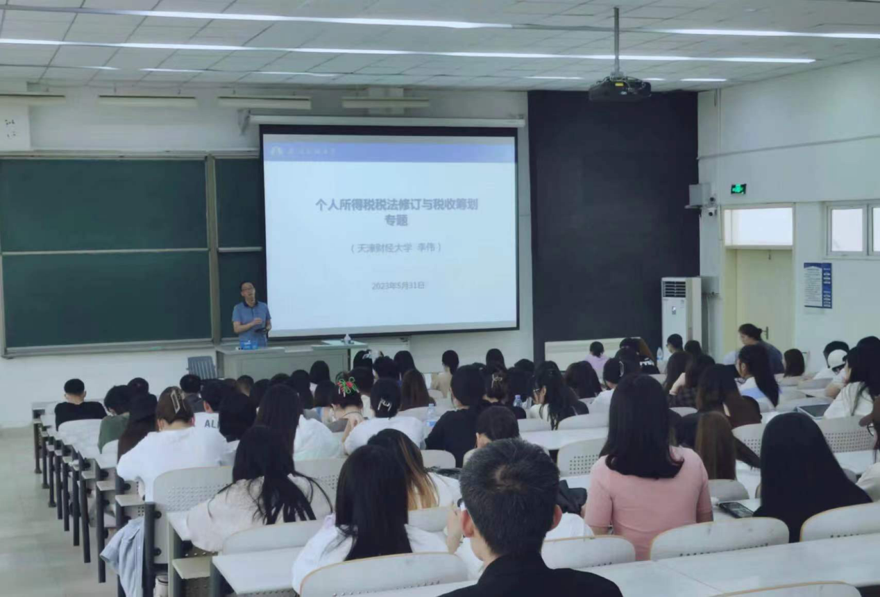 5月31日下午,在日新楼210,BEAT365英国官网财税与公共管理学院副院长李伟教授为学院师生作了题为“个人所得税税法修订与税收筹划”的专题讲座。本次讲座由教师教学发展中心、李兰英名师工作室和财税系联合举办,财税系学科带头人李兰英教授主持,财税系全体教师和税收专业200余名学生聆听了讲座。