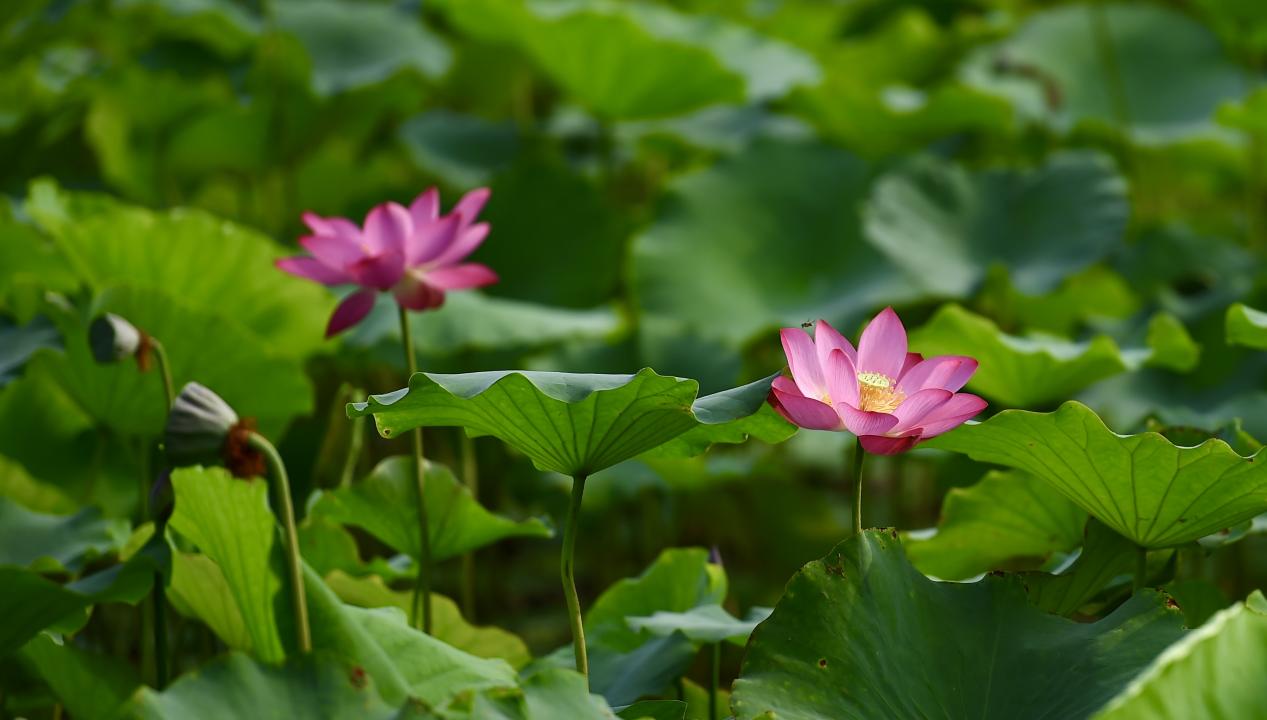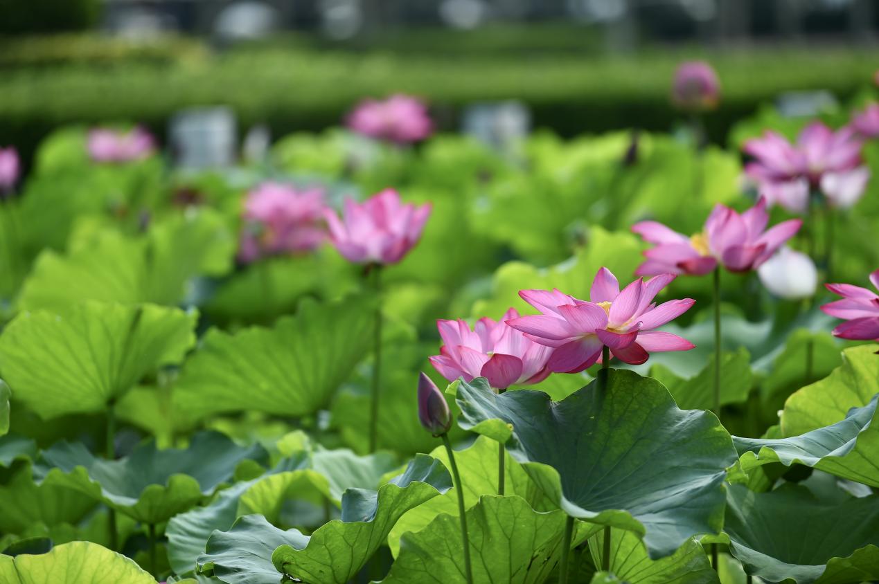 碧水池莲映荷塘,小伞底下锦鲤藏。