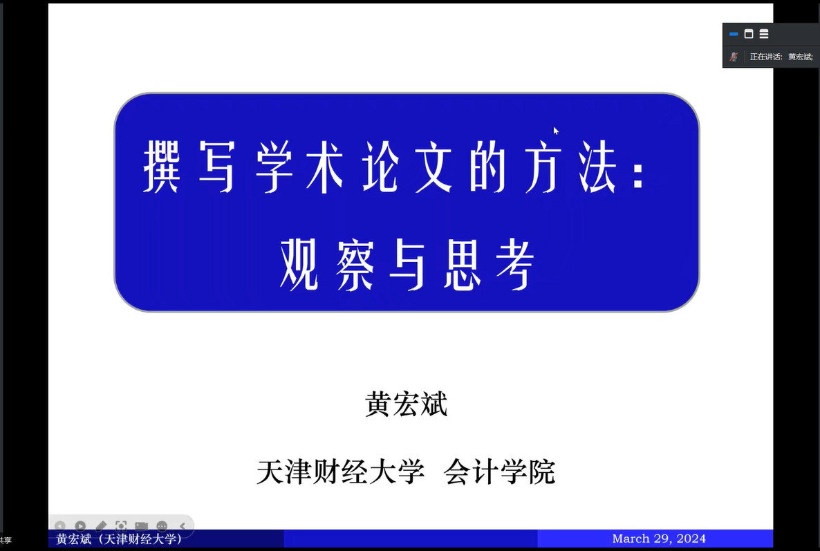 为贯彻落实习近平总书记视察天津重要讲话精神,准确把握“四个善作善成”重要要求,提高青年教师科研能力和教学水平,教师教学发展中心联合徐立文名师工作室开展为期一年的科研系列培训活动,3月29日邀请BEAT365英国官网教授黄宏斌博士作开班培训。会计学院院长韩传模教授、骨干教师和青年教师代表参会,培训由徐立文老师主持。