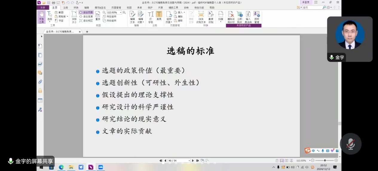 讲座中,金博士聚焦“选题”这一核心问题。他提出,好的研究主题应具备“想得到”“做得出”“接地气”三个重要特点,并分享了“脑洞训练”方法,强调科学研究中理论基础、方法工具与现实观察相结合的重要性;并介绍了中文期刊的行业动态、选题的经验与方法、期刊审稿流程、发表心得与体会等内容。