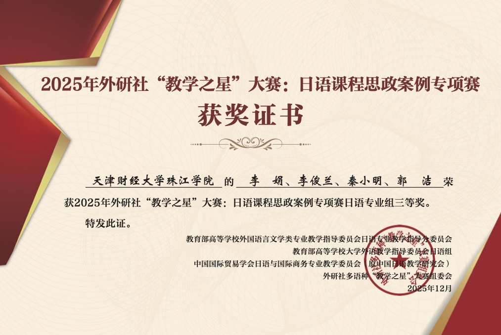 近日,2025年外研社“教学之星”大赛:日语课程思政案例专项赛获奖名单公布,人文学院外语系日语教研室两支教师团队分别荣获日语专业组全国三等奖和大学日语组全国三等奖。