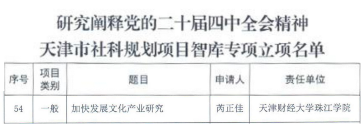 近日,天津市社科工作办公示了“研究阐释党的二十届四中全会精神天津市社科规划项目智库专项立项名单”,艺术学院艺术设计系教师芮正佳主持的《加快发展文化产业研究》项目成功获批一般项目立项。