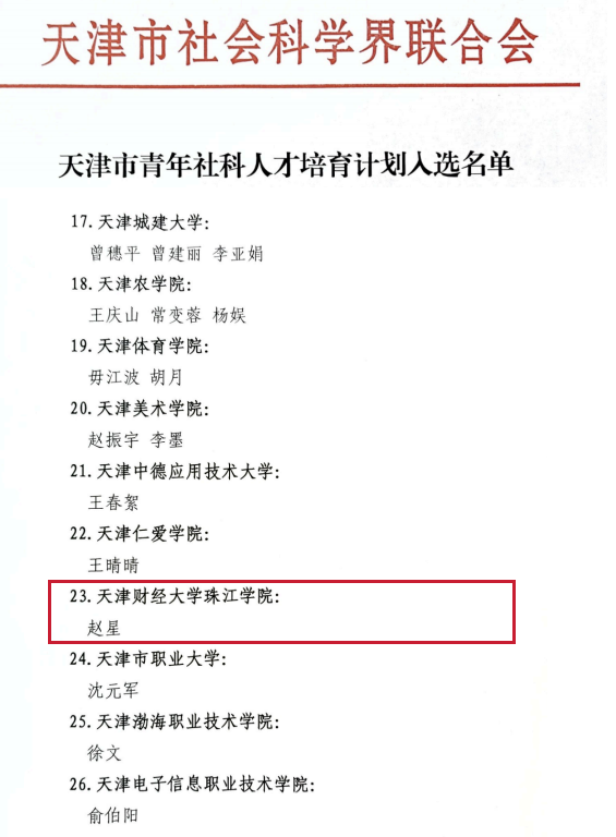 近日,天津市社会科学界联合会公布了天津市青年社科人才培育计划入选名单,经济学院金融系赵星副教授成功入选。