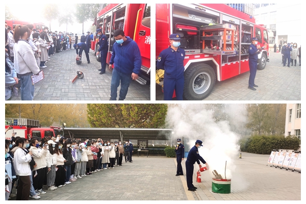 活动现场,京津新城消防救援站战士首先向我院师生介绍了不同类型的消防救援车辆及车载消防器材的功能作用。随后,又模拟火灾现场,现场演示了无齿锯、破拆工具、灭火器等消防器材的使用方法。同时,本次活动还设置了材料发放、宣传展板、灭火演练等多个环节,方便师生获取日常生活中消防安全知识以及应急处置常识。