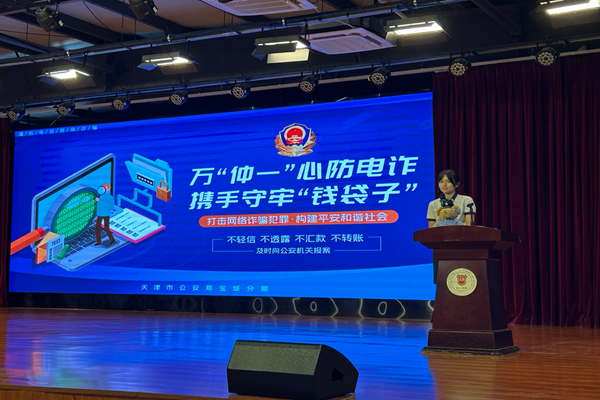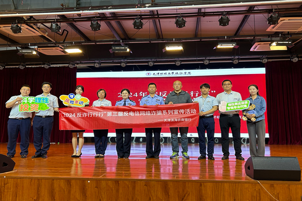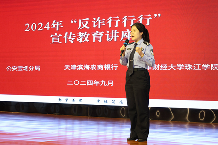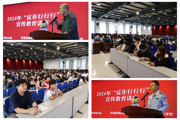 为进一步提升在校大学生的反诈防诈意识,有效遏制电信网络诈骗案件的发生,激励广大青少年成为反诈行动的支持者、传播者和践行者,2024 年 9 月 25 日,学院联合公安宝坻分局反诈中心朴仲一警官、京津新城派出所张建斌警官以及天津滨海农商银行宝坻支行以“反诈行行行”为主题共同举办了一场别开生面的反诈宣传教育讲座,讲座由安全部副部长王学武主持,400余名学生参加。