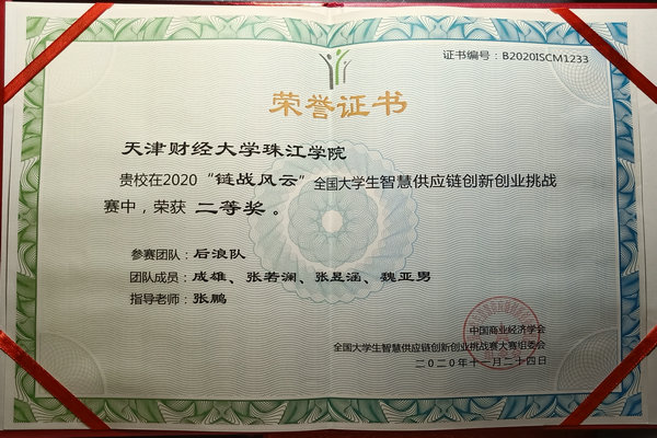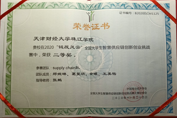 全国合计220所本科院校共459支队伍参加比赛,大赛历时将近2个月,采取网络竞赛方式进行。每个参赛队伍4位参赛选手分工协作,在全国不同城市,经营制造业、分销业、零售业与物流业等不同行业,在相互竞争与合作中构建供应链体系。最终由成雄、张若澜、张昱涵、魏亚男4位同学组成的后浪队,郑琬琳、葛旻玥、余曦、王美怡4位同学组成的supply chain队均荣获全国二等奖。