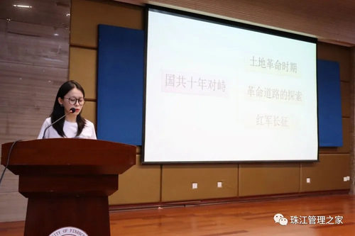 比赛开始前,汉服文化社为我们带来了精彩的表演。表演完后,主持人介绍了本次比赛的相关规则,比赛正式开始。首先,C组根据“国共十年对峙”这个话题,从长征开始、遵义会议、长征结束这三个方面展开叙述。最后,C组同学以“长征精神”:乐于吃苦、勇于战斗、重于求实、善于团结告诫新时代青年要不忘初心,并以此结束了他们的演讲。