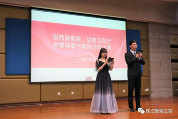 2021年5月24日下午6点,管理学院学生会学习部举办的“思而清前路,党意与我行”思维导图与案例分析大赛决赛在弘毅楼演播厅举行,出席本次比赛的有管理学院学生会和人文学院学生会主席、部长团及学生观众。