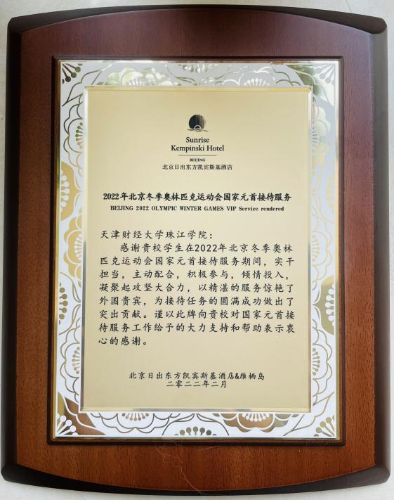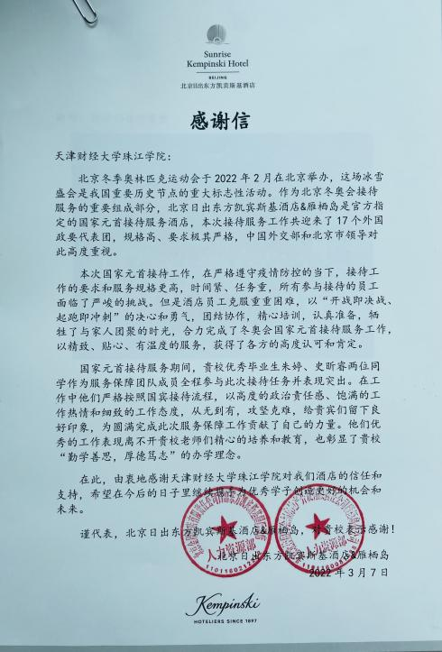 2022年2月北京冬季奥运会举办期间,管理学院酒店与旅游管理系朱婷、史昕睿两位同学作为服务保障团队成员全程参与北京日出东方凯宾斯基酒店&雁栖岛酒店国家元首接待任务,并以优异的成绩完成此次重要接待工作。在工作中,他们严格按照国宾接待流程,以高度的政治责任感、饱满的工作热情和细致的工作态度,攻坚克难,给贵宾们留下良好的印象。