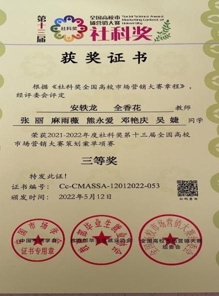 日前,由中国社科院财经战略研究院指导、中国市场学会主办的“社科奖”第十三届全国高校市场营销大赛获奖名单公布,管理学院市场营销专业学生钱娜,李梦然,李颖欣,褚佳慧,王艾欣同学组成的“向阳队”获得一等奖;由张丽,马雨薇,熊永爱,邓艳庆,吴婕同学组成的“芋泥啵啵队”获得三等奖,创造了历史佳绩。
