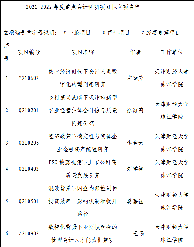 从近日天津市会计学会印发了关于《天津市财政局、天津市会计学会关于公布2021-2022年度重点会计科研项目立项名单的通知》获悉。管理学院会计学系申报的《数字经济时代下会计人员数字化转型问题研究》等6项科研项目全部获批立项。其中,一般项目1项,青年项目4项,自筹项目1项。
