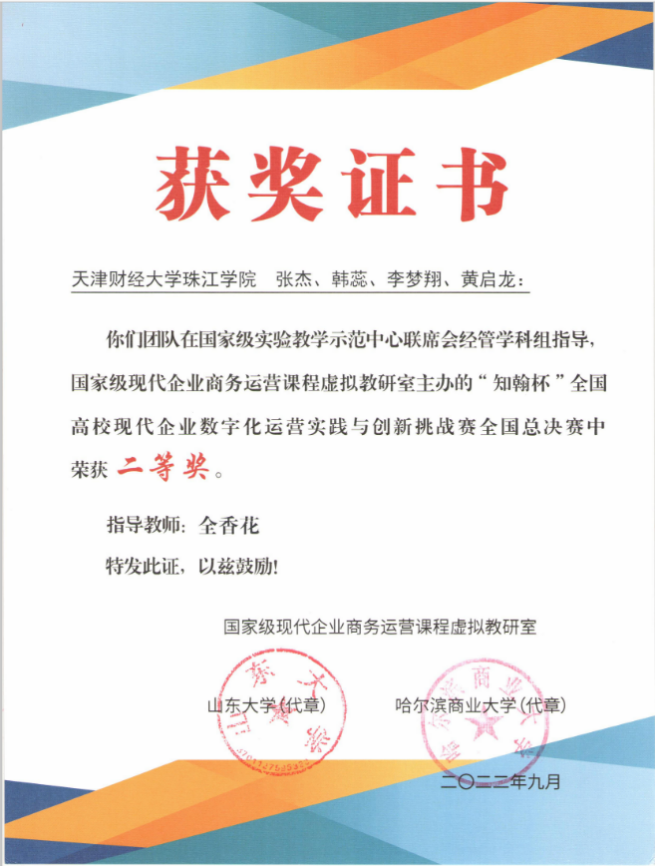 近日,管理学院管理系全香花老师带队的学生张杰、韩蕊、李梦翔、黄启龙组成的代表队在“知翰杯”全国高校现代企业数字化运营实践与创新挑战赛中荣获二等奖。