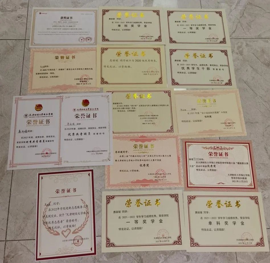 在学习上,她刻苦钻研专业知识,力求上进。面对考试中的失误也曾经迷茫过,也否定过自己的能力,但经过反思,她很快为自己制定了新的目标,对自己提出了更高的要求。平时上课认真听讲,努力学好每一门课程,从不无故缺席旷课,课堂上她不断改进学习方法,下课后虚心向老师和同学请教,课余时间认真完成老师布置的每一项作业,最终“功夫不负有心人”,她连续两年获得一等奖学金、单科奖学金,一次性通过大学英语四级考试、普通话考试,并多次参加校内外比赛,荣获外研社·国才杯写作大赛三等奖;第六届模拟联合国大会优秀奖; 第四届浪潮杯团体二等奖; 2022年“批改网杯”全国大学生英语词汇大赛决赛二等奖等。虽然取得了一点小成绩,但她从不骄傲自满,反而一如既往的努力学习,充实、完善自我。