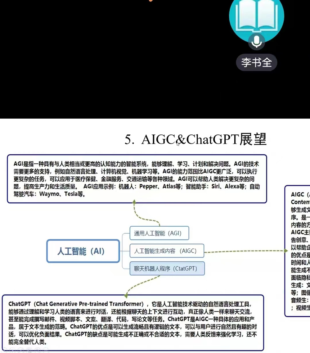 讲座中,李书全老师首先从Chat GPT的本质,特点,技术特性等方面讲述了什么是Chat GPT,随后带领大家了解了Chat GPT的发展历程,基本原理以及Chat GPT与人工智能,机械学习,深度学习,计算机视觉,自然语言处理之间的关系,让师生对Chat GPT工作原理及相关技术有了更加直观地了解。最后讲述了Chat GPT的应用场景和未来的发展前景,讲到了Chat GPT对人类交流与学习的潜在影响。在讲座最后,安轶龙老师与李书全老师就Chat GPT的相关教学研究进行了深度交流,使听众师生对于Chat GPT原理及其应用有了更深刻的认识。