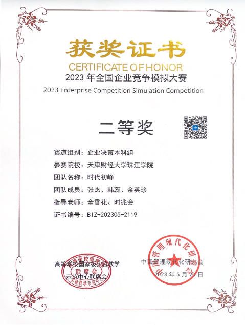 近日,2023年全国企业竞争模拟大赛在中国矿业大学闭幕,本届大赛共计381所院校3356支队伍报名参加全国复赛。经过初赛、复赛、决赛的激烈角逐,由管理学院教师全香花、时兆会指导,张杰(营销2101)、韩蕊(酒管2102)、余英珍(人力2002)三名学生组成的“时代初峥”团队获得全国二等奖。