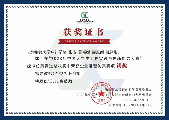日前,由教育部高等学校工程训练教学指导委员会主办、国家级实验教学示范中心联席会经管学科组协办,教育部高等教育司指导的2023年中国大学生工程实践与创新能力大赛企业运营仿真竞赛全国总决赛在山东大学落下帷幕。管理学院由张杰、莫嘉妮、周恩西、陈泽彤组成的队伍在全香花、田雅娟老师的指导下,斩获大赛铜奖!