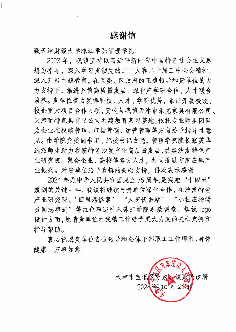 近日,管理学院收到天津市宝坻区方家庄镇人民政府的感谢信,感谢管理学院在促进“校政企”合作、推动地方经济发展方面所作出的积极贡献。这封感谢信不仅是对管理学院努力的认可,更是对未来合作的激励。