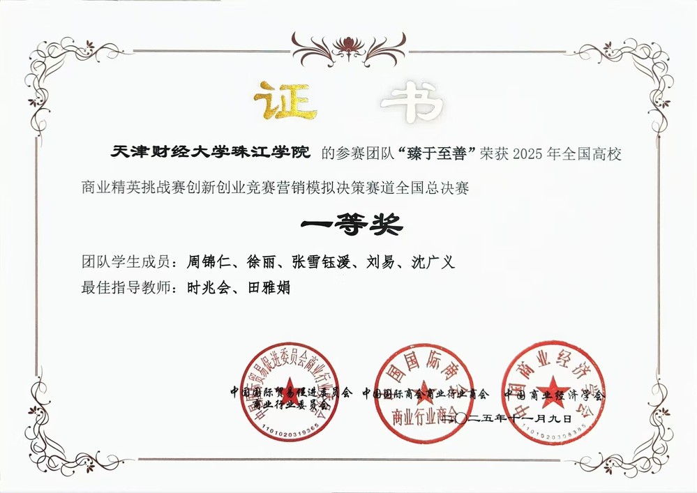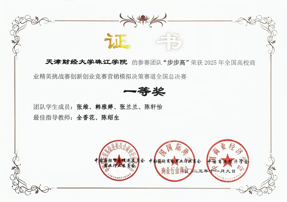 全国商业精英挑战赛创新创业竞赛是国内高校创新创业领域的标杆赛事之一,覆盖创业、营销、流通等多个赛道,位列教育部大学生榜单第47项。该赛事要求团队在限定周期内完成全链条商业决策,同时应对市场不确定性,全方位考察学生商科实战能力与团队协作水平,是高校商科学生的 “实战练兵场”,在教育界与行业内认可度颇高。