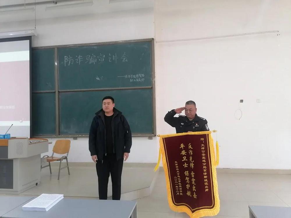 讲座结束后,熊老师向一直以来支持经济学院安全工作的京津新城派出所、安全部和一直以来扑在反诈一线工作上的丁玉东警官表示了感谢。 随后,熊老师代表经济学院为丁警官赠送了锦旗。红色的锦旗上面写着“平安卫士,保驾护航,反诈先锋,雷霆出击”,金黄色的字熠熠生辉,闪耀着在场的每位同学,“全民反诈”也深深印刻在每位同学的心里!