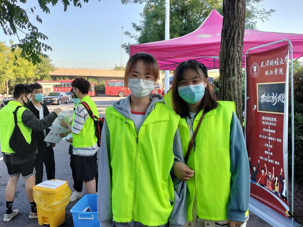 在校外,志愿者分赴天津站、天津西站等重要交通节点,分组开展咨询等服务工作。我被分配到天津西站,负责清点人数、陪同新生及其家长在去学校大巴上答疑解惑等工作。每一位志愿者仔细指引,耐心聆听,认真回复家长的问题,帮助新生顺利抵校。