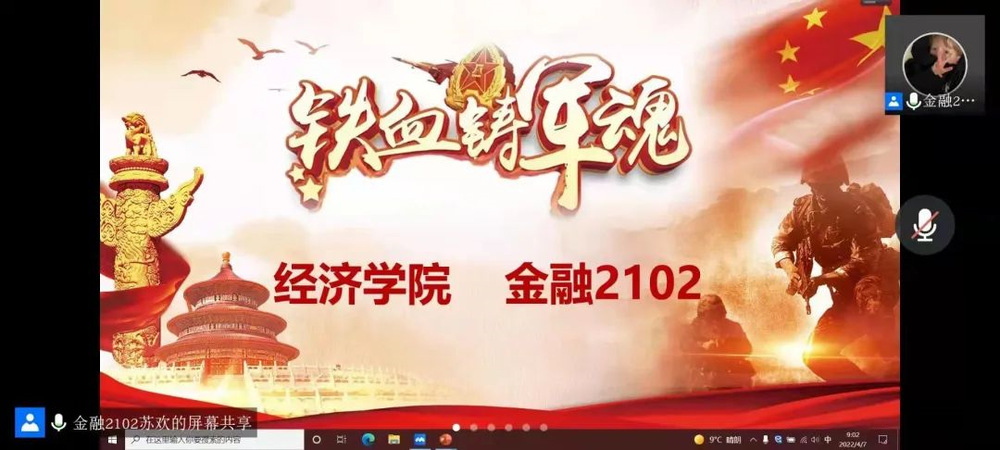 在金融2102的班会上,同学们邀请退役复学的学生代表杨兴黎在线分享了投身军旅的经历和感想。在部队期间,杨兴黎从荒漠戈壁滩到宁夏青铜峡再到西藏前线,坚决服从指挥安排,参与军事演习和锻炼,无论是身体素质、思维模式,还是为人处事,从幼稚到成熟,不断提升自己。“军人,战争年代就要冲锋陷阵,精忠报国。和平年代就要戍边守疆,传承使命与荣光。着身军装,就等于扛起了一份责任,担起了一种使命。”从杨兴黎的表达中,我们感受到了他对祖国的热爱,对军队的赤诚,对军人的敬仰。他的分享,也让同学们更深切的体会到了军人训练的艰苦,以及不怕苦、不怕累,讲团结,守纪律的优秀品质和钢铁精神。