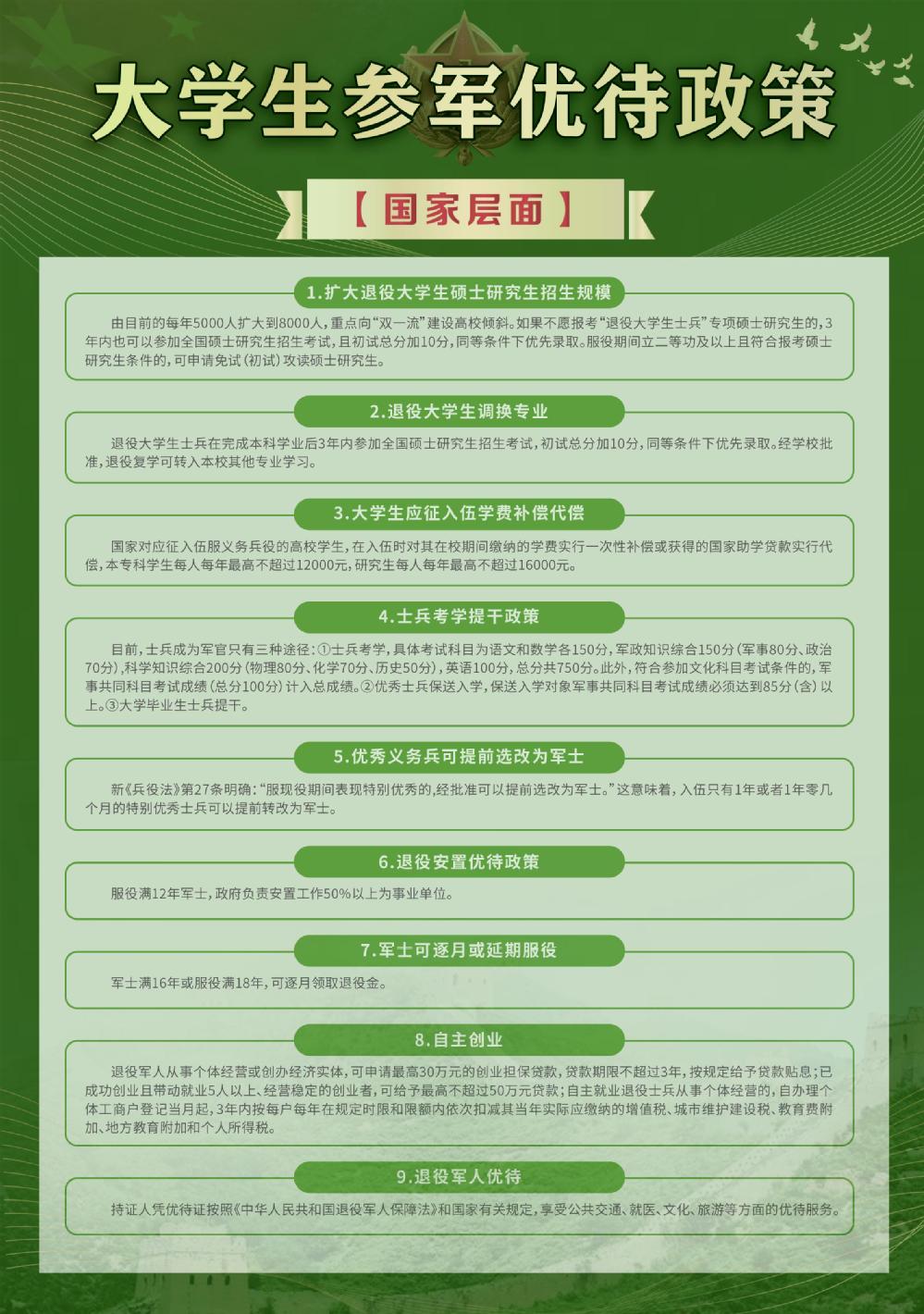 投身军营,逐梦青春。大学生入伍具有重要意义,响应祖国召唤,保家卫国,守护万家灯火。依法服兵役也是中华人民共和国每一位公民义不容辞的责任和义务,希望有志于从军报国的同学,积极投身绿色军营,磨炼意志,增长才干,勉励奋斗,为民服务,为军队增添新鲜血液。