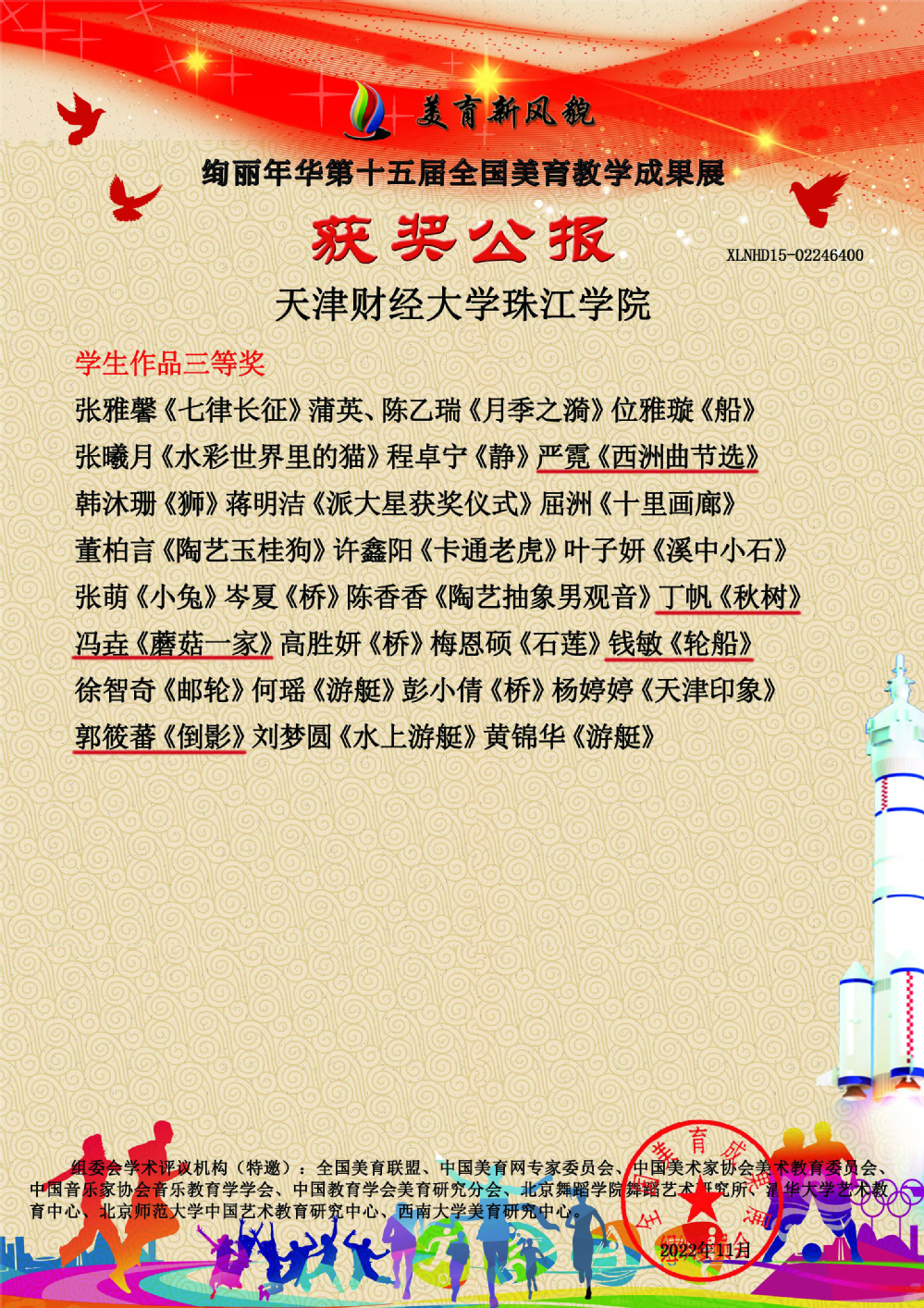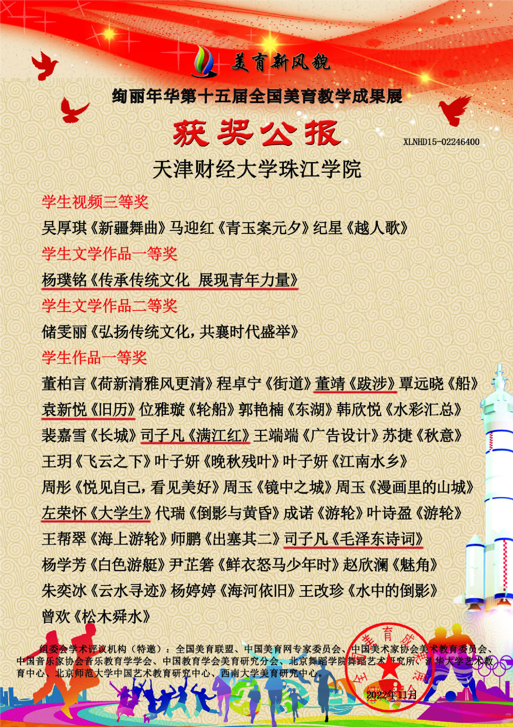 经济学院积极落实学院美育工作,践行立德树人根本任务,充分发挥美育功能,面向全年级学生进行宣传美育新风尚·第二届珠江美育教学成果展活动。经济学院共29名学生参加本次美育活动,共提交35件作品,作品涵盖美育教学成果类、美术类、中华优秀传统文化类。通过学院评委组推荐,最终,经济学院18名学生共计21件作品在美丽新风貌·绚丽年华第十五届全国美育教学成果展评中获奖,获一等奖6件、二等奖9件、三等奖6件。