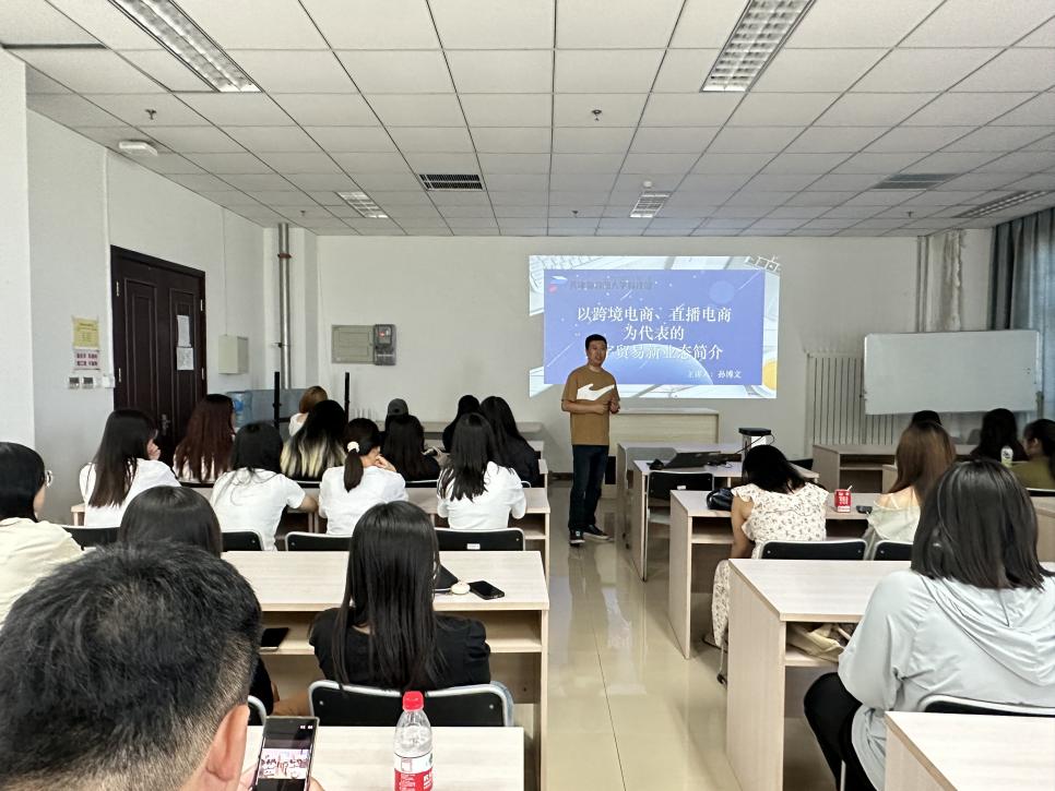 首先,园区副总经理孙博文介绍了天津海教园大学科技园的建设背景、基本情况、主要功能、发展模式等有关内容。在随后的讲座环节,孙总为同学们带来了《以跨境电商、直播电商为代表的数字贸易新业态》的主题分享,向各位同学深入浅出地讲解了数字贸易的有关知识以及行业发展现状。学生们对此表现出了浓厚的兴趣,积极参与互动, 现场反响热烈。