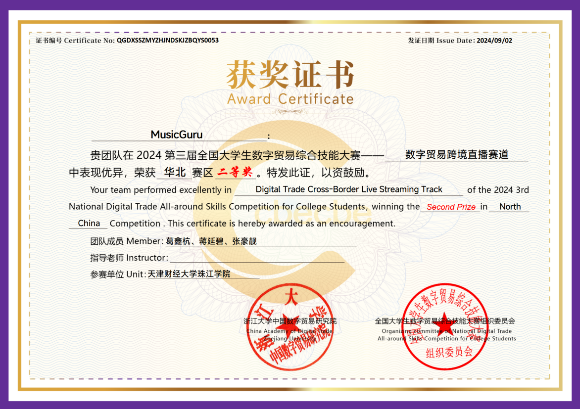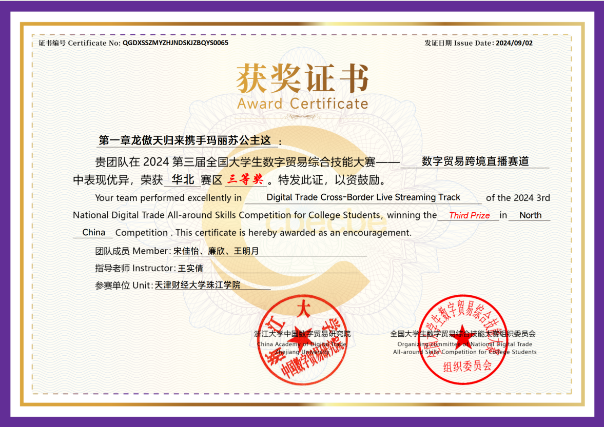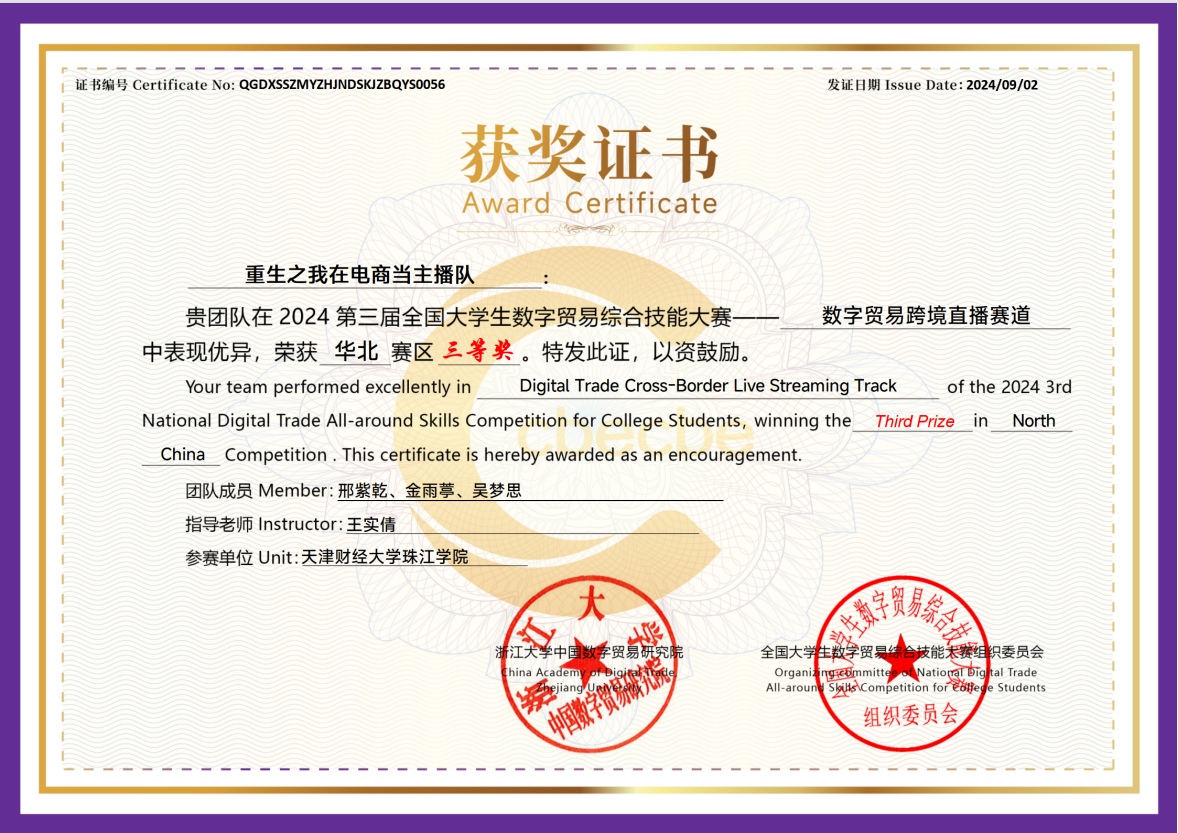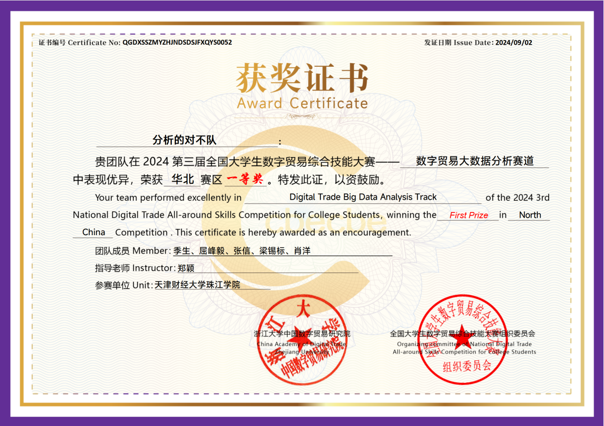2024年7月31日,第三届全国大学生数字贸易综合技能大赛区域赛(华北赛区)竞赛结果揭晓。经济学院郑颖、王实倩老师带领学生取得一等奖1项,二等级1项,三等奖2项。“分析的对不队”入围全国总决赛。