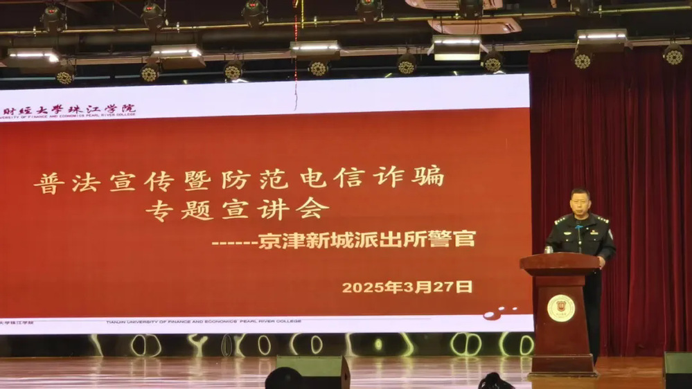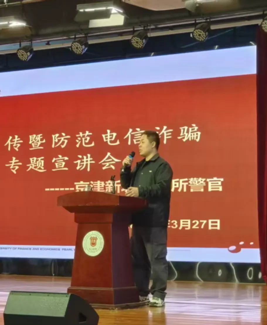 为提高师生的法律意识和防范电信诈骗的能力,3月27日下午,经济学院特别邀请京津新城派出所张建斌警官于素教中心二楼开展普法宣传暨防范电信诈骗专题宣讲会。党总支书记,学工办主任戈彤,辅导员钱晓峰、卢瑶、李怡、张颖及百余名学生共同参会。