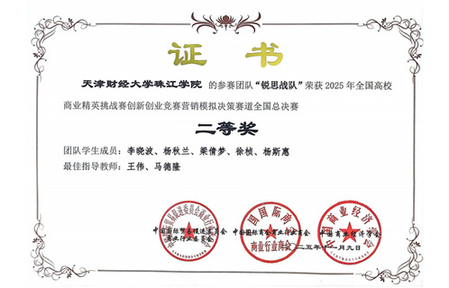 近日,由中国贸促会商业行业委员会、中国国际商会商业行业商会及中国商业经济学会共同主办的2025年全国高校商业精英挑战赛创新创业竞赛全国总决赛圆满落幕。经过激烈角逐,经济学院代表队在王伟、马德隆两位老师的悉心指导下,凭借扎实的专业功底与出色的团队表现,荣获全国总决赛二等奖。