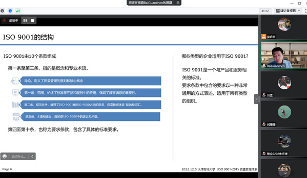 12月5日晚,西门子电气传动有限公司供应商质量管理经理白冠辰为我院师生作了一场题为“ISO9001:2015质量管理体系介绍”的讲座。此次讲座采取线上形式进行,讲座由数据工程学院院长助理田孟主持,数据工程学院师生及其他院系部分师生参加了此次讲座。