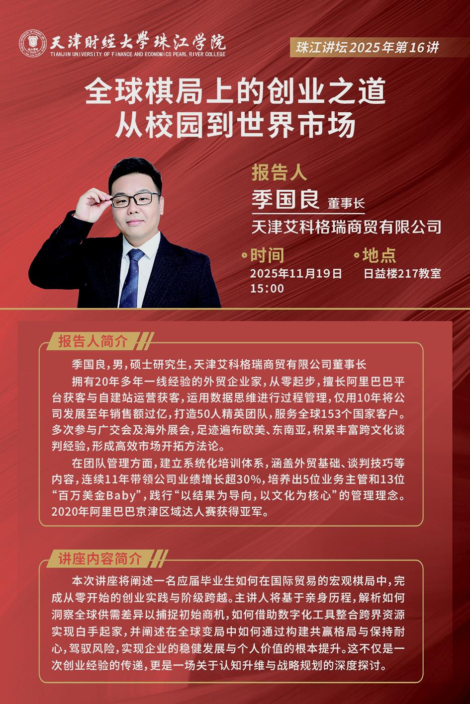 珠江讲坛预告|全球棋局上的创业之道:从校园到世界市场