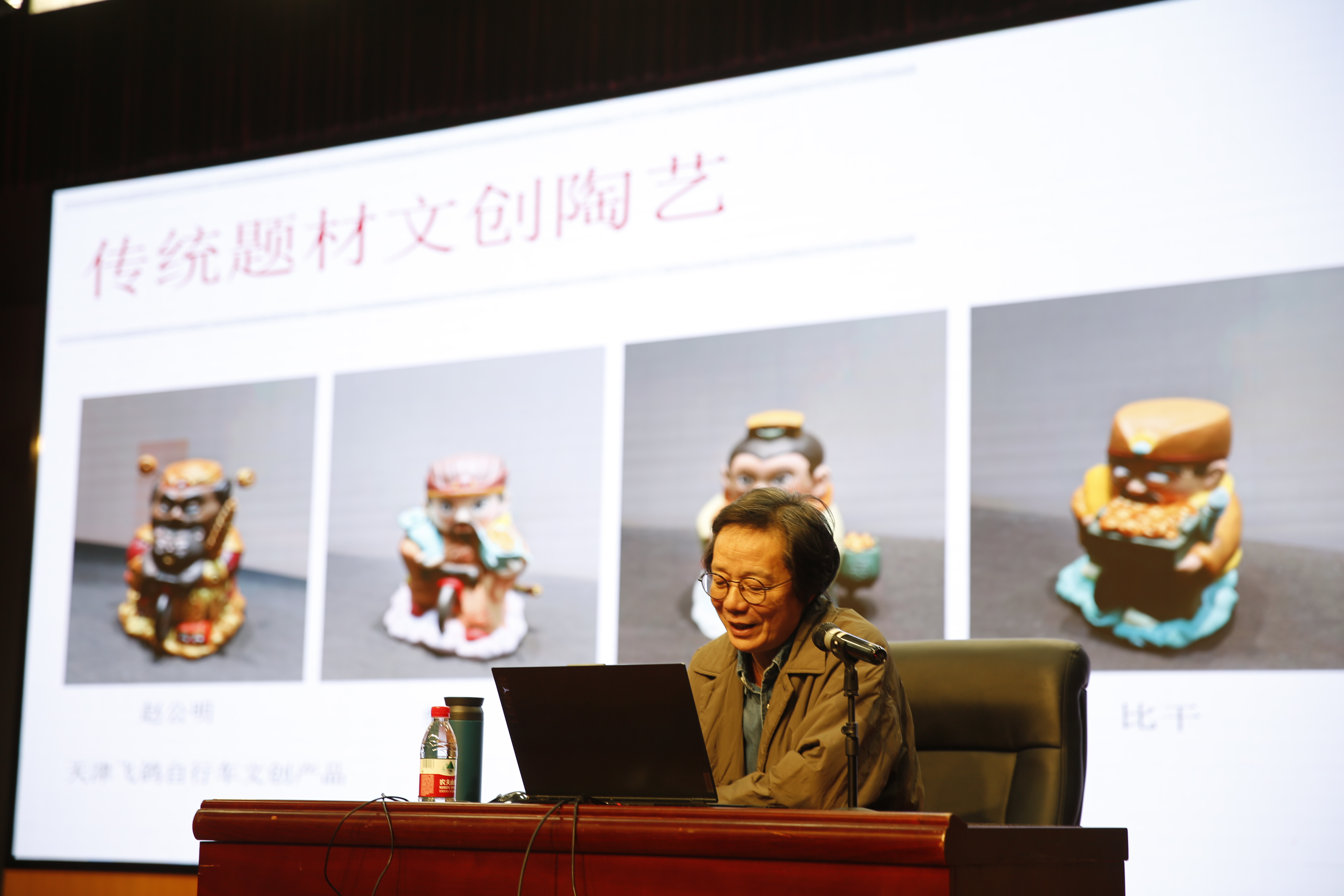 3、美育如何落地见效。主讲人以文创案例为切入点,展示了其个人荣获 “敦煌杯” 奖项的《敦煌乐伎》陶艺雕塑,作品取材自传统壁画,运用卡通造型契合当代审美,展现了传统与现代的审美融合。