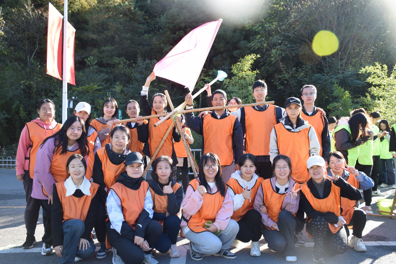 活动现场,在拓展教练的指挥下,破冰团建热身活动很快消除了大家的陌生和距离感,来自不同部门、不同学院的教职工们迅速组成4支拓展队伍,金铠甲队、活力橙队、绿豆营队、绝绝紫队等响亮的队名尽显新入职教职工风采。接着,队员们自创队旗、口号,以别出心裁的造型亮相,展示各自团队实力。
