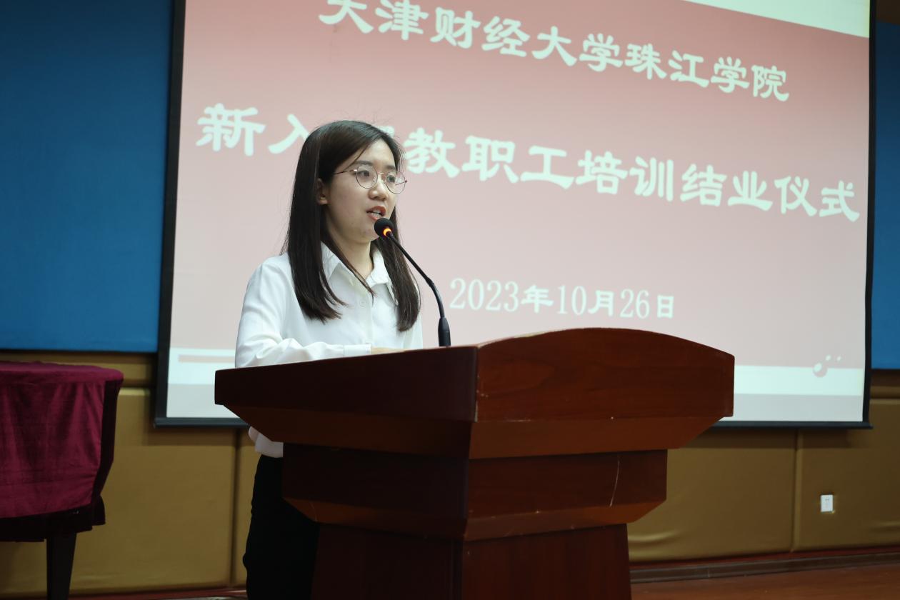 人文学院张珊、政治理论课部王珍兰两位老师代表新入职教职工作交流发言,与大家分享了培训收获及感悟。两位老师均表示,通过培训,加深了对学院的文化认同和归属感,进一步坚定了作为教育工作者的职业信念和道德操守,在今后的工作中,将始终秉承“勤学、善思、厚德、笃志”的校训,满怀信心和决心,为开创学院高质量发展新局面作出积极贡献。