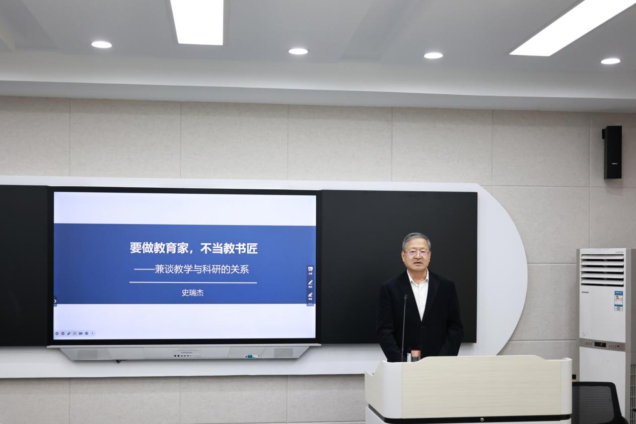 天津社会科学院二级教授史瑞杰以“要做教育家,不当教书匠——兼谈教学与科研的关系”为题,阐述了教育家精神的核心要义,强调了教育是一种创造性活动。他深入分析了教学与科研的关系,并指出科研是强校之路,教学是生存之本,科研是发展之源。他鼓励新入职教职工将个人研究与国家战略需求相结合,深耕专业领域,实现个人价值与育人使命的统一。