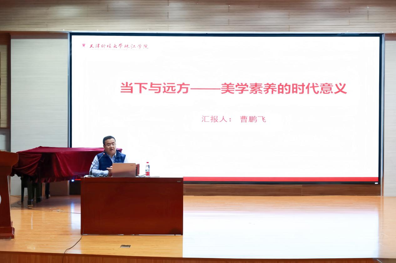 在美学素养讲座中,艺术学院副院长、名师工作室负责人曹鹏飞副教授结合学院人才培养实际,从指导思想、核心概念、历史源流、时代价值等方面系统解读美学素养的重要性。为了让新入职教职工从理论认知延伸至实践感知,在艺术学院李雅菲、郭雨轩两位老师指导下开展校歌学唱活动,通过歌词解读与旋律赏析,感悟校园文化内涵。