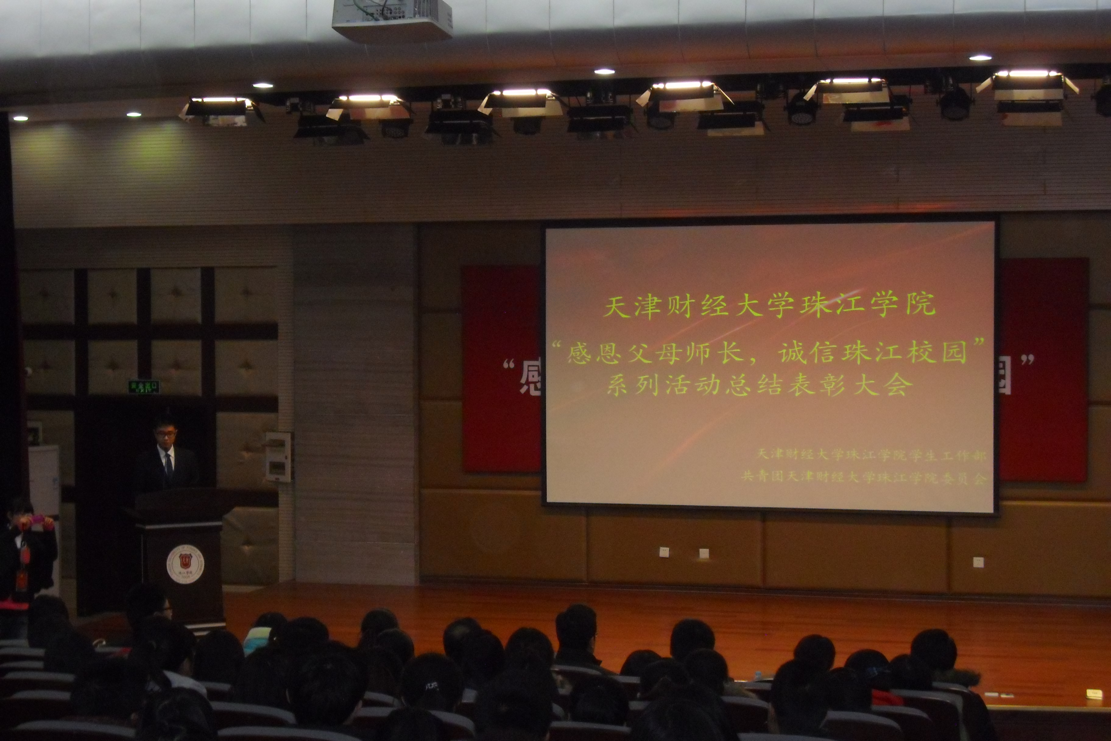 一段视频播放完毕后,表彰大会正式开始。首先进行的是先进集体评比活动。各系派出一名代表依次上台发言。外语系的演讲者是来自日语1212班党丹,她感性激情的发言与制作新颖的PPT配合精准,获得了现场观众和评委的一致好评;接着,播放了院级四大学生会组织联合制作的活动视频,展示活动成果;随后,由周圆老师宣读了“感恩父母师长,诚信珠江校园”主题系列表彰大会获奖的优秀个人和先进集体,外语系荣获优秀团体第二名的好成绩,在绘画征文活动中,日语1211班孙楠获得感恩类征文第三名,英语1115班王琳获得诚信类征文第二名,之后学院领导为获奖个人和集体颁发证书和锦旗;最后,副院长李金亮上台讲话,鼓励同学们要学会感恩,孝敬父母,做文明的大学生。