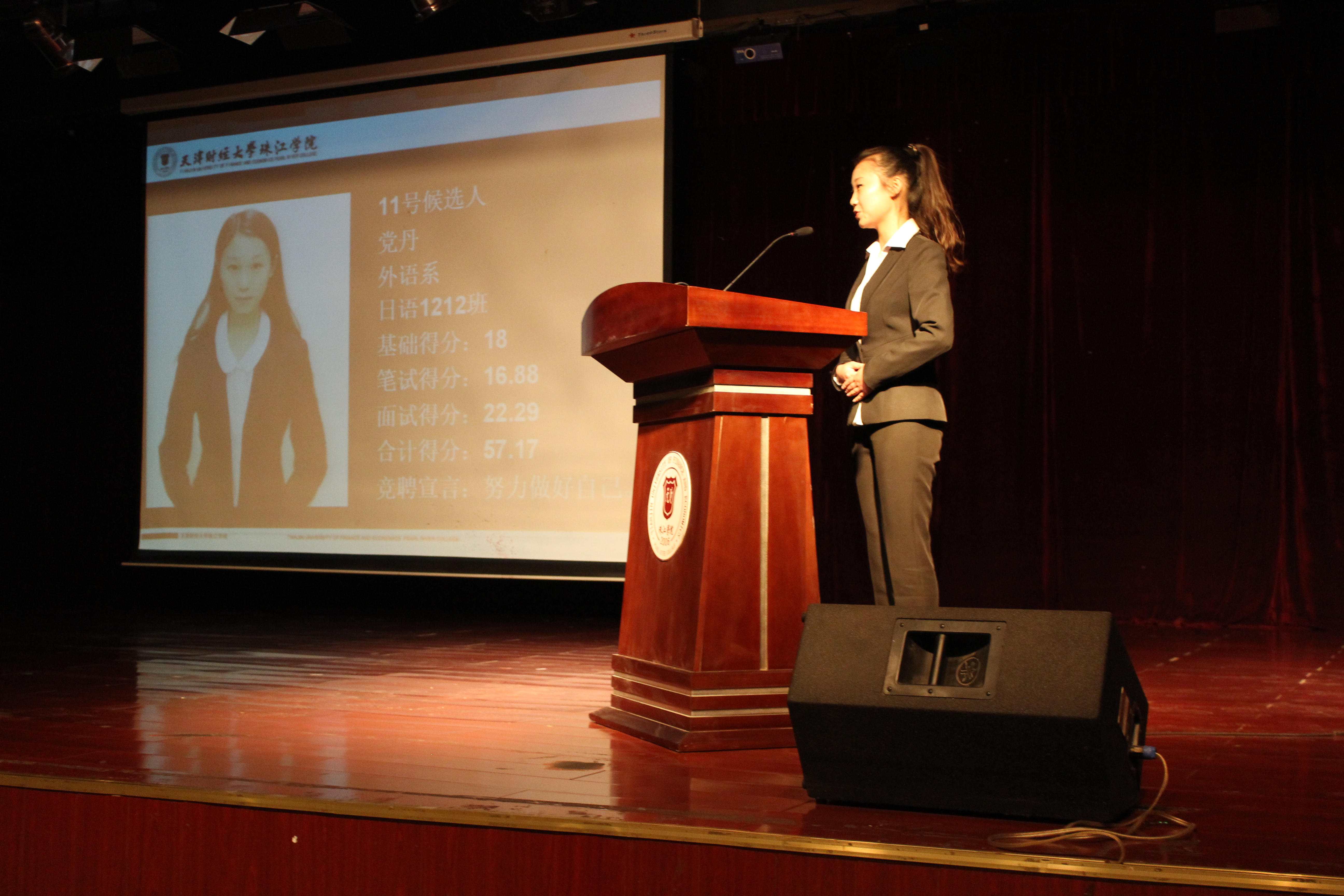 此次会议在国歌声中隆重开幕。首先,由李金亮副院长致开幕词,大会审议并通过院学生会主席倪莉诗的学生会工作报告。本次学代会参加竞选的17名同学利用PPT自我介绍和现场演讲的方式进行了竞选,把自己优秀的一面展现给广大学生代表。外语系代表队推选党丹和袁铁柱两位优秀学生进行竞聘,两人的演讲精彩纷呈,详细介绍了自己的大学生活和学习情况,以及如何在学生工作中施展才能,向大家展示自己与众不同的一面。其中党丹同学更是通过演讲与PPT完美结合而脱颖而出,并简单阐述了自己在接下来一年的工作设想,其慷慨激昂的演讲给大家留下深刻印象。大会本着民主、公开、公开、公正的原则,采用无记名投票方式选举产生了新一届院学生会主席团成员,我系党丹同学以优秀的成绩当选。最后,新一任学生会主席郭雯代表全体学生宣读倡议书,领导讲话宣布大会闭幕。学生代表大会圆满成功。