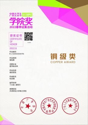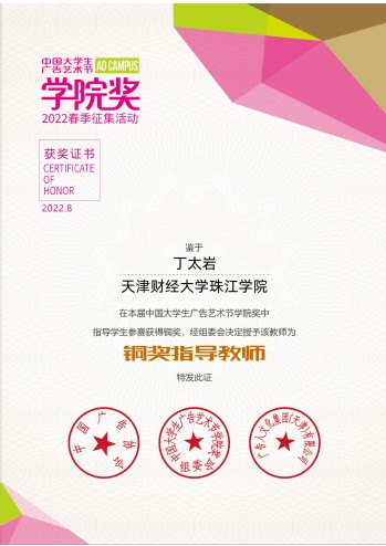 学院奖对优秀指导教师进行表彰,为了感谢老师们对学院奖的付出,广告人文化集团董事长李文龙先生、广告人文化集团副总裁、学院奖项目总负责人袁健女士为我院丁太岩老师、谢择月老师颁发《铜奖指导教师》荣誉证书。