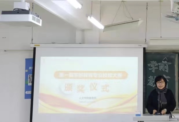 韩映虹主任对本次技能大赛进行点评,韩映虹主任称各个小组的作品展示给大家带来了巨大的惊喜,期待大家继续努力,将学前教育专业教师技能大赛打造成人文学院继中华优秀传统文化系列竞赛、英语达人秀之后的第三大亮点活动。