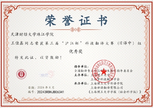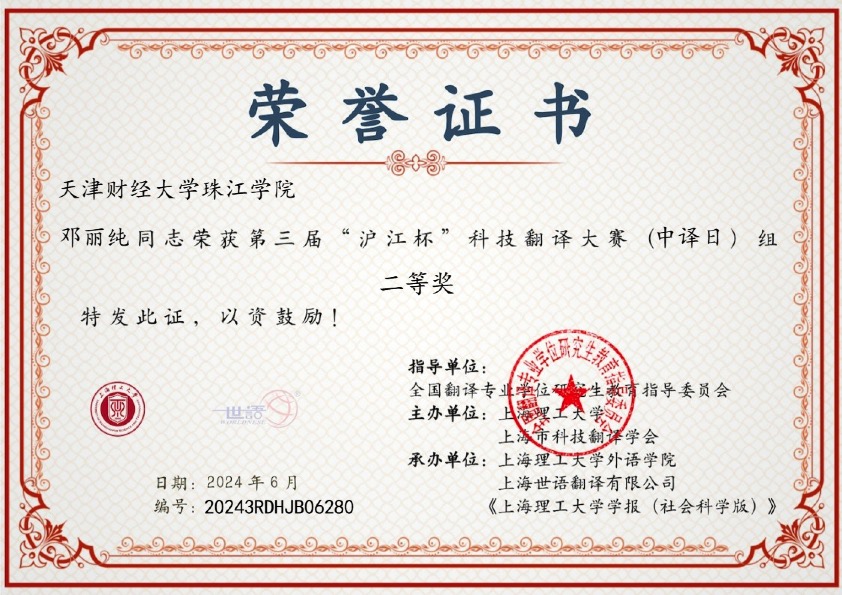 第三届“沪江杯”科技翻译比赛是在全国翻译专业学位研究生教育指导委员会指导下,由上海理工大学、上海市教委外国留学生世语实践基地、上海市科技翻译学会主办的全球性赛事。此次大赛有来自全球285家院校及企事业单位,共计2261人次报名参赛。邓丽纯、王佳鑫两名同学在日语教研室秦小明老师的指导下斩获佳绩,展现了扎实的日语运用能力和翻译能力。