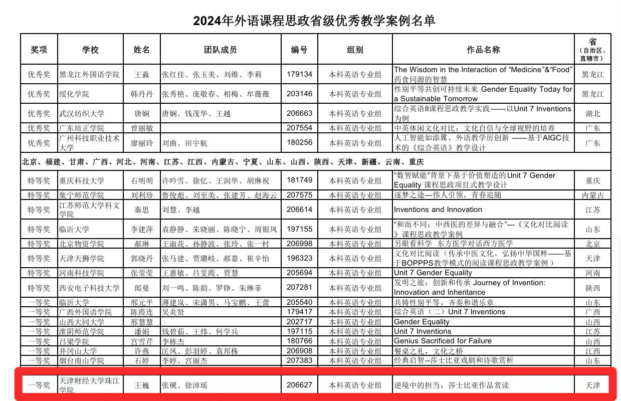 近日,由高等教育出版社、全国高校教师网络培训中心与中国外语编辑部共同开展的2024年外语课程思政优秀教学案例征集与交流活动成绩揭晓,人文学院教师王巍、张砚、徐沛瑶组成的教师团队获得“英语专业组”省赛一等奖。