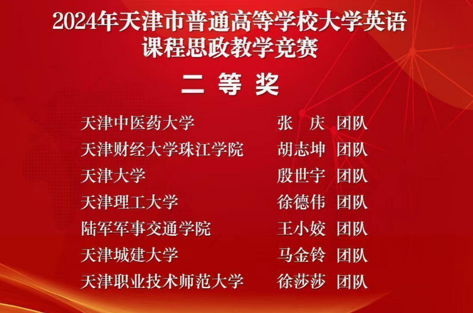 近日,天津市普通高等学校大学英语课程思政教学竞赛决赛在天津大学外国语学院圆满结束。我院人文学院胡志坤团队(胡志坤,姜瑞红,张宵,王俊义,张姝)在众多参赛队伍中脱颖而出,荣获二等奖。