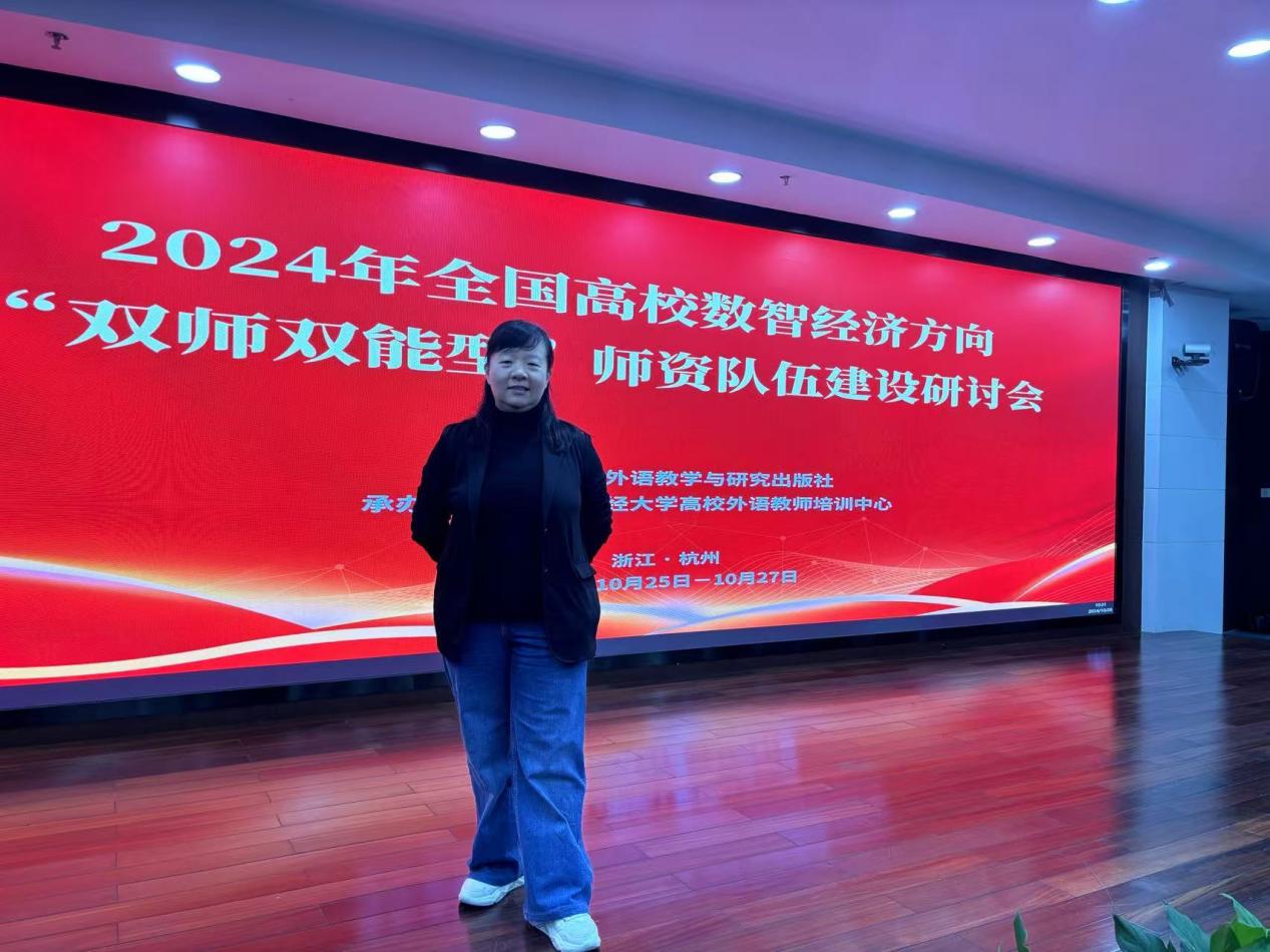 为进一步落实二十大报告精神、助力人文学院培养应用复合型人才,人文学院院长助理左宝霞教授于10月25日至27日在浙江省杭州市参加了由外语教学与研究出版社和浙江财经大学高校外语教师培训中心共同举办的“2024 年全国高校数智经济方向‘双师双能型’教师培训班”。