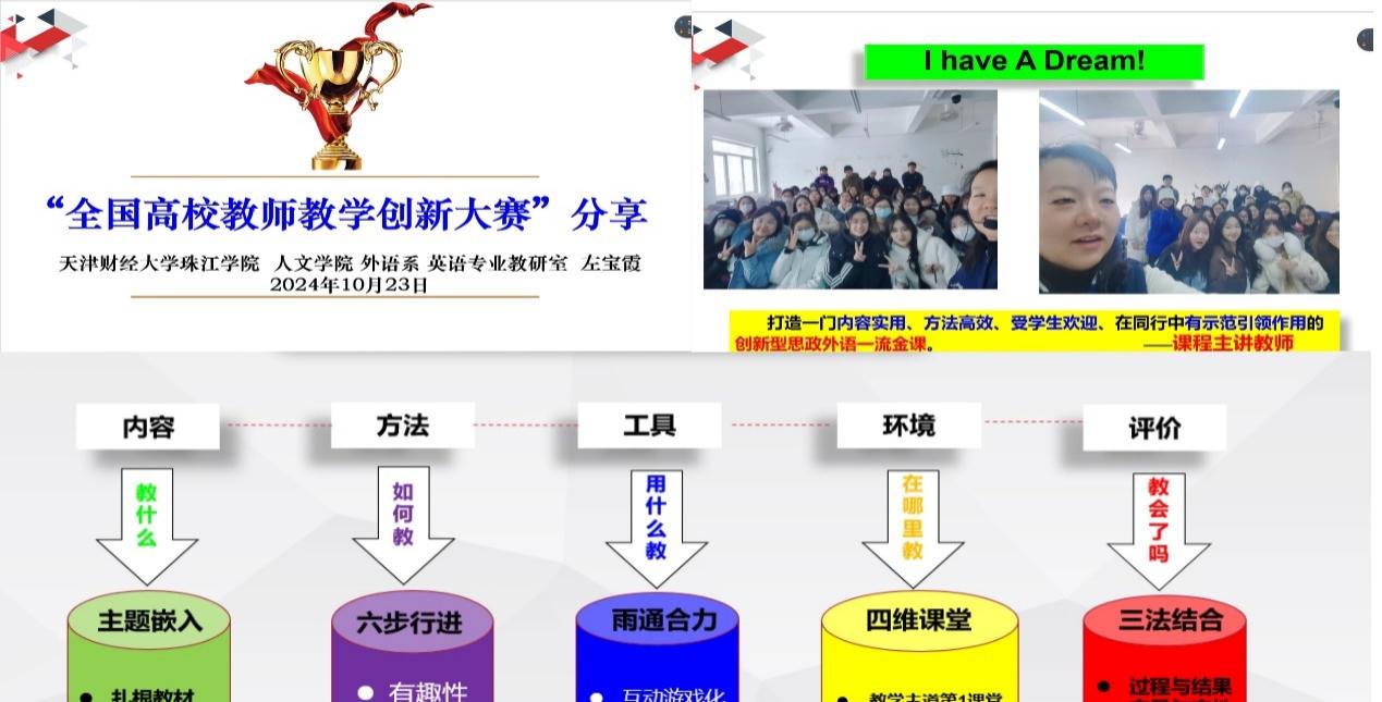 王巍老师介绍了参加外研社和高教社两个课程思政优秀教学案例大赛的心得,并分享了参加文秋芳教授主持的云共同体虚拟虚拟教研室学习的体验。两次参赛获奖均得益于向专家学习前沿理论应用于教学设计实践的收获。